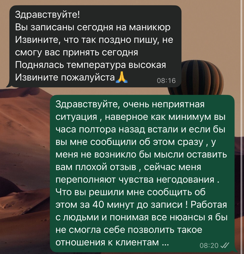 Имейте ввиду , возможно, если вы уже выехали на маникюр. За 40 минут до начала, вам могут отменить запись. Качество оценить не могу , так как запись не состоялась.
